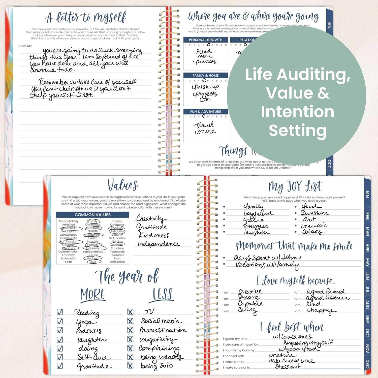 - BONUS ELEMENTS: Packed with life coaching worksheets and inspirational features to help you set and achieve all of your goals for the year: personal mission statement prompt and yearly goal setting page, weekly scheduling template, values page, habit tracking, vision board, monthly spending log, 12 notes pages, inspirational quotes, monthly challenges, and more!