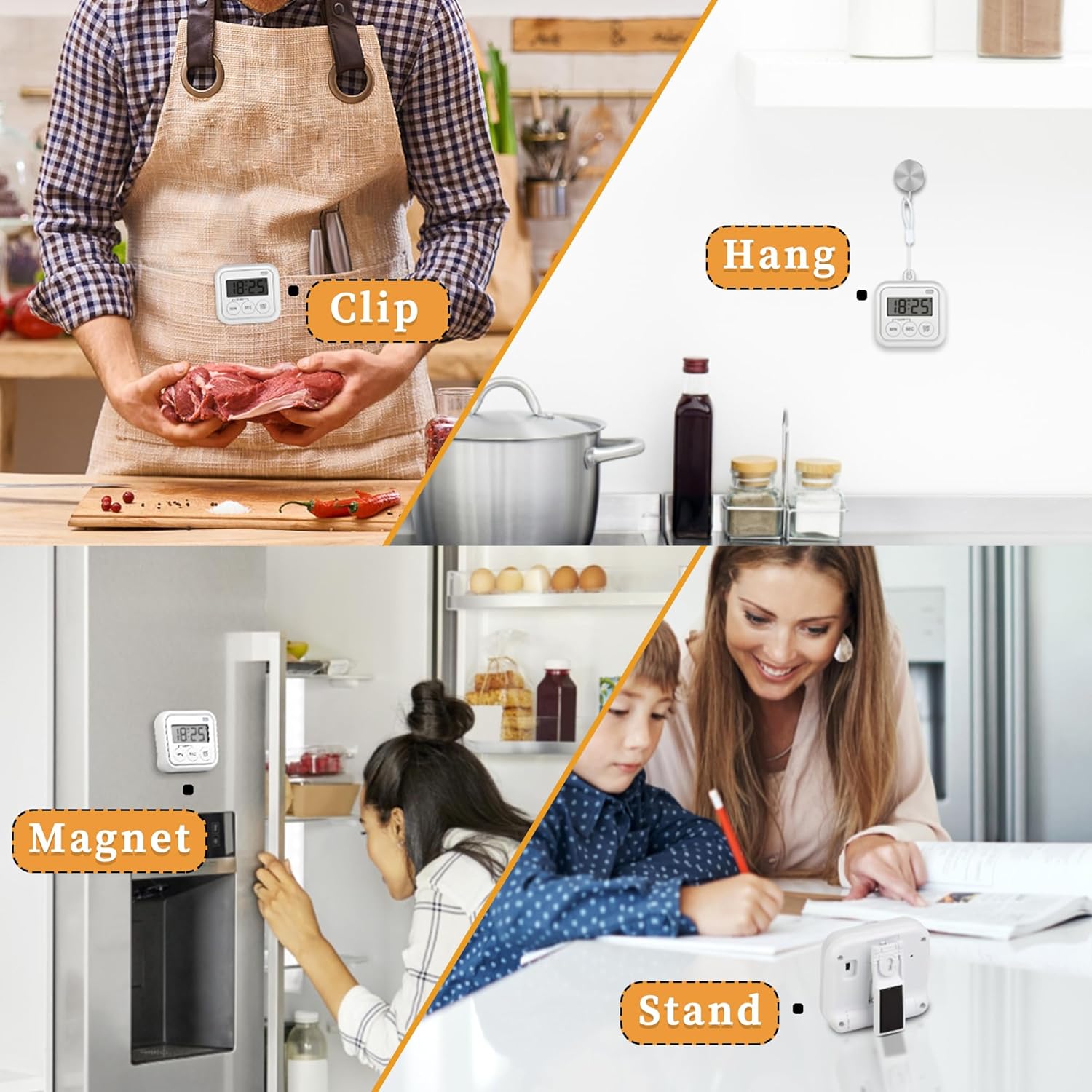 - New Upgrade: Strong back magnet/hanging hole/clip in one. Can be adsorbed on the refrigerator, oven, microwave; can be hung; can be clipped on the desk baffle, or even the clothes pocket. The bottom widened design is easily placed on the desktop.