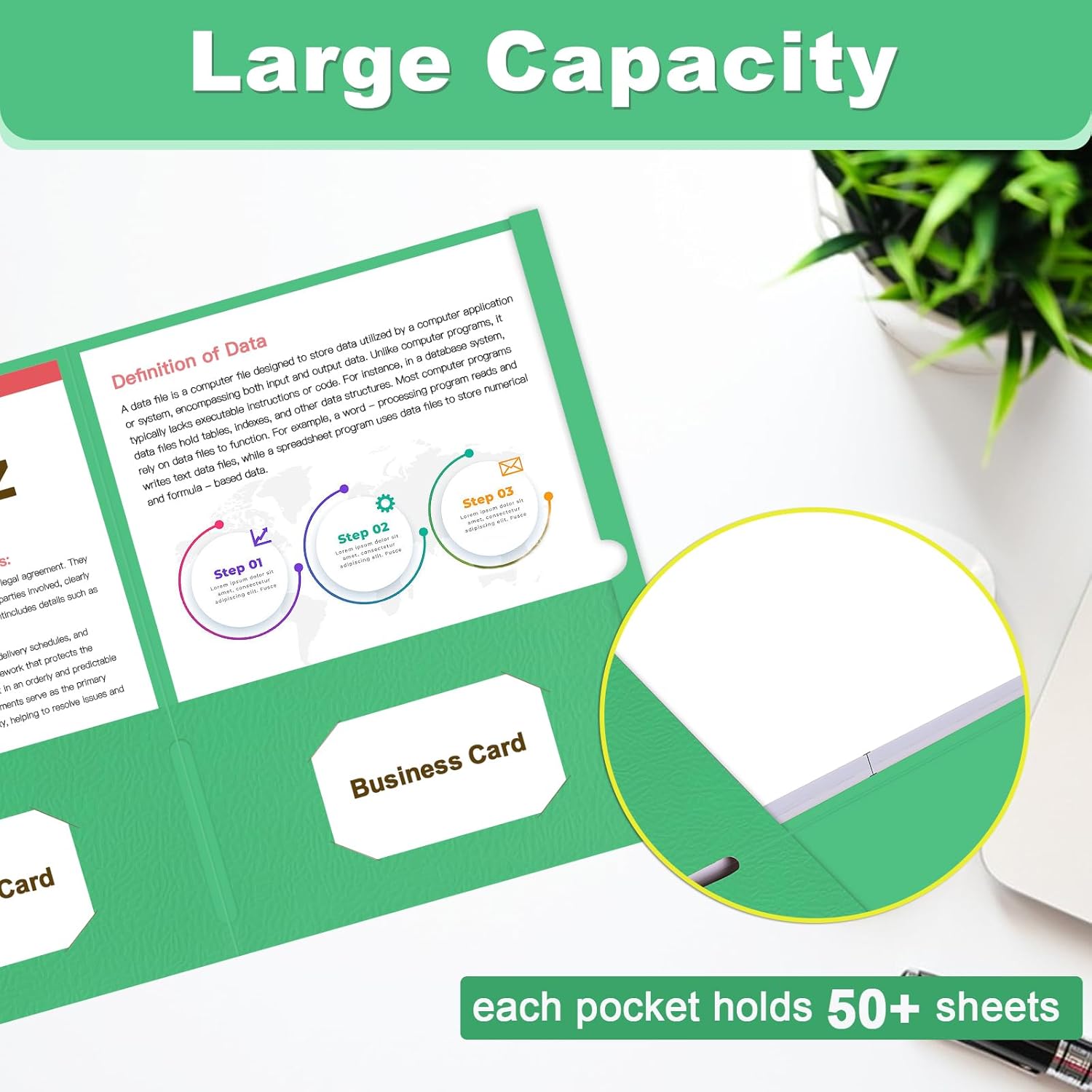 - Large Capacity: 60 pack pocket folder has two deep pockets that hold over 50 sheets of paper each. 2 business card slots for instant access to important contacts without the need for a separate business card holder.