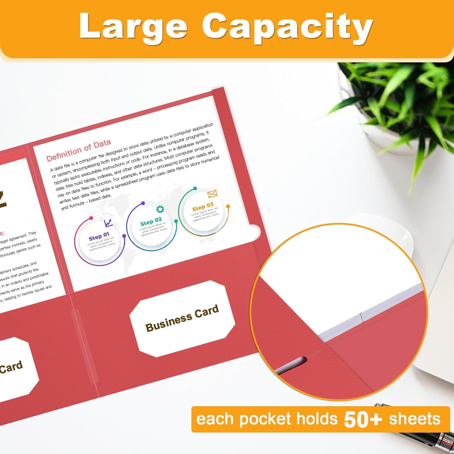 - Large Capacity: 60 pack pocket folder has two deep pockets that hold over 50 sheets of paper each. 2 business card slots for instant access to important contacts without the need for a separate business card holder.