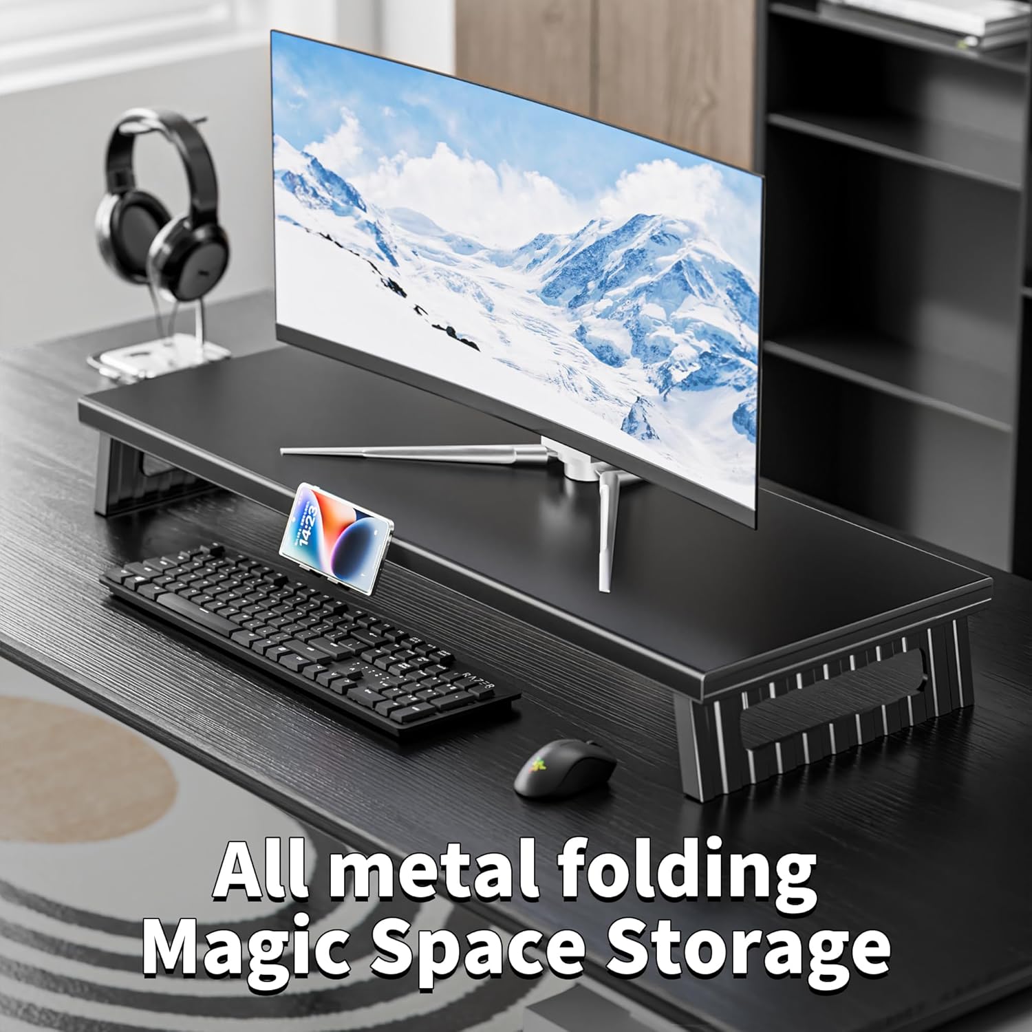 All-Metal Foldable Monitor Stand with 28cm Wide Desktop,, Headphone & Mic Jack, Detachable Phone Holder, (Basic Version, 760mm)