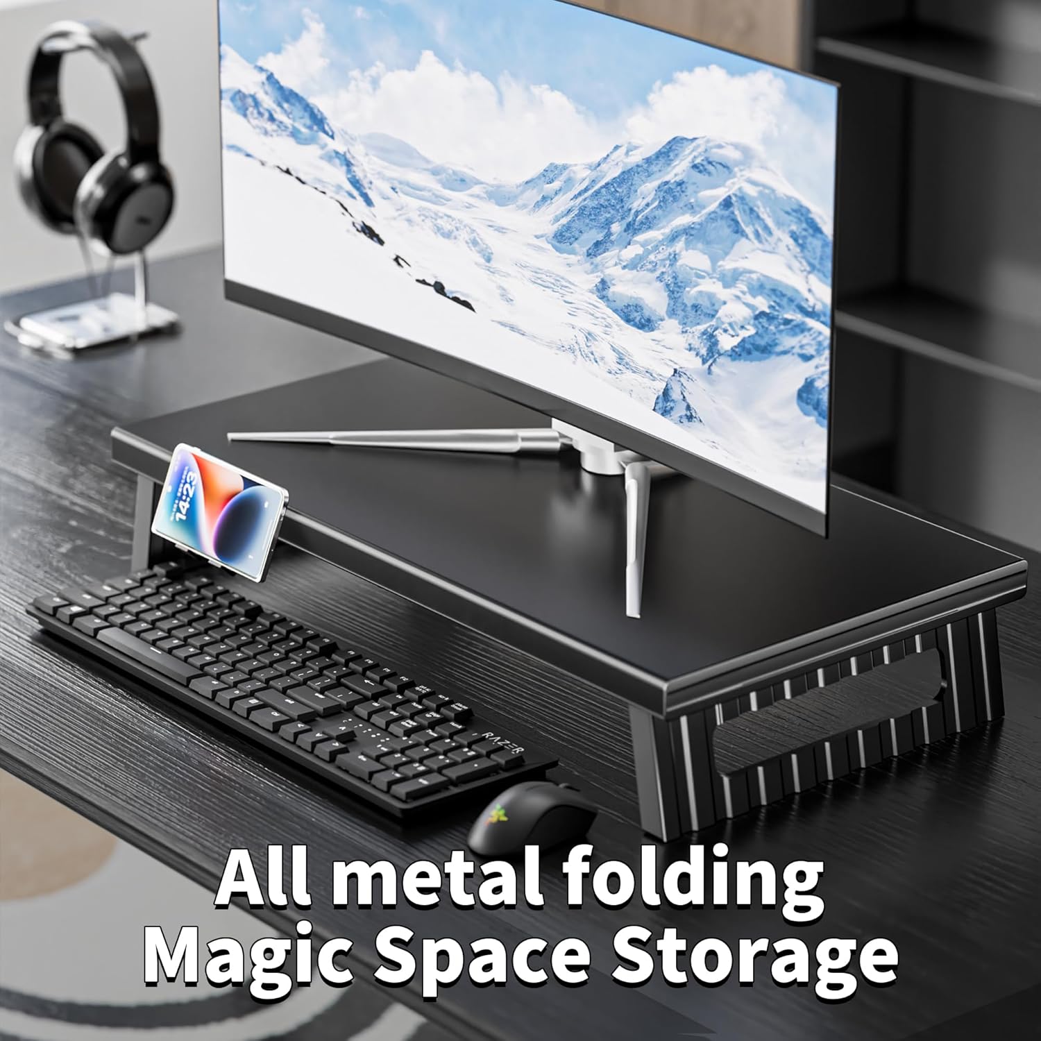 All-Metal Foldable Monitor Stand with 28cm Wide Desktop,, Headphone & Mic Jack, Detachable Phone Holder, (Basic Version, 530mm)