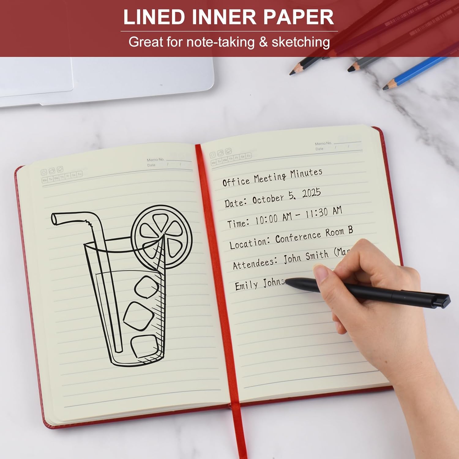 - 192 Pages Lined Journal Notebooks: 6 red hardcover notebook, ,192 pages/96 sheets per notebook (1152 pages/ 576 sheets in total), adequate for work, meeting, studying. The paper of the leather notebook is thick enough that ink won't bleed through. The light yellow paper is more eyes comforting, release eyes burden when writing. It is the ideal notebook for work, school, meeting, travel and dairy