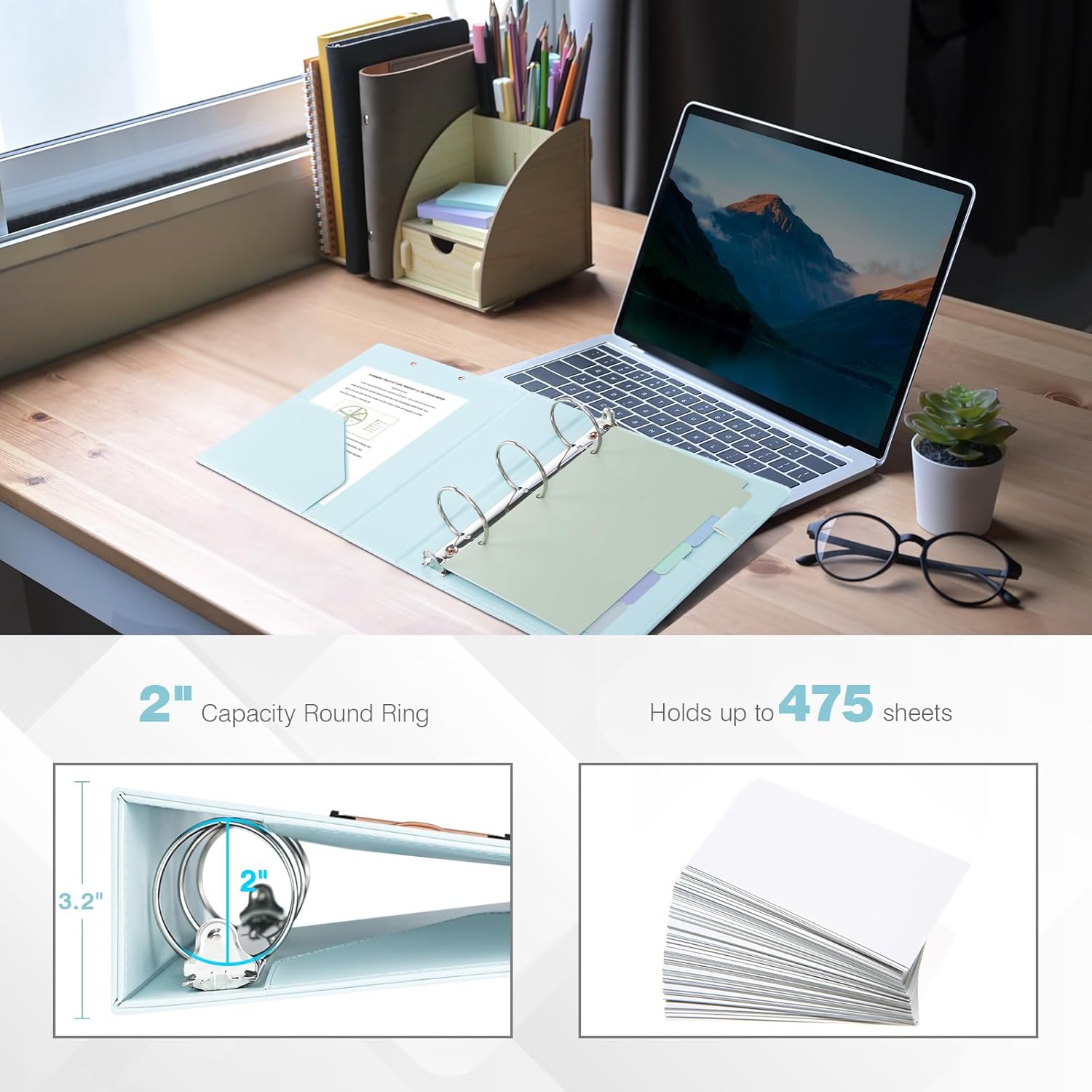 - 【Massive 2" Capacity】2-inch round rings securely hold 475+ sheets. Features dual interior pockets for documents, plus a 5-tab divider with pre-labeled stickers for instant organization.