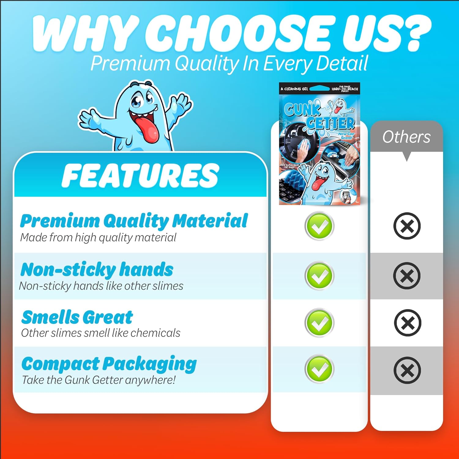 - SMELLS GREAT - Other slimes smell like chemicals. The Gunk Getter is scented. OoOoOh YeAahH! SAFE AND CAR-FRIENDLY: Crafted from high-quality, natural materials, Gunk Getter cleaning putty is gentle on your car’s surfaces, ensuring it cleans effectively without leaving scratches or residue. This eco-conscious cleaning gel is designed to pick up even the tiniest particles of dirt while remaining safe for your car’s interior. Say bye to Dust, crumbs, dirt, and gunk. KISS THOSE CRUMBS GOODBYE!