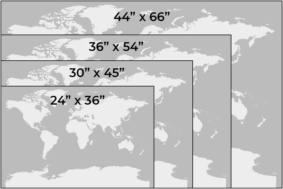 • Find the Perfect Fit – Choose from four sizes: 24"x36", 30"x45", 36"x54", or our extra-large 44"x66" to match your space. Each map includes 150 push pins in red, white, and black to mark your travels!