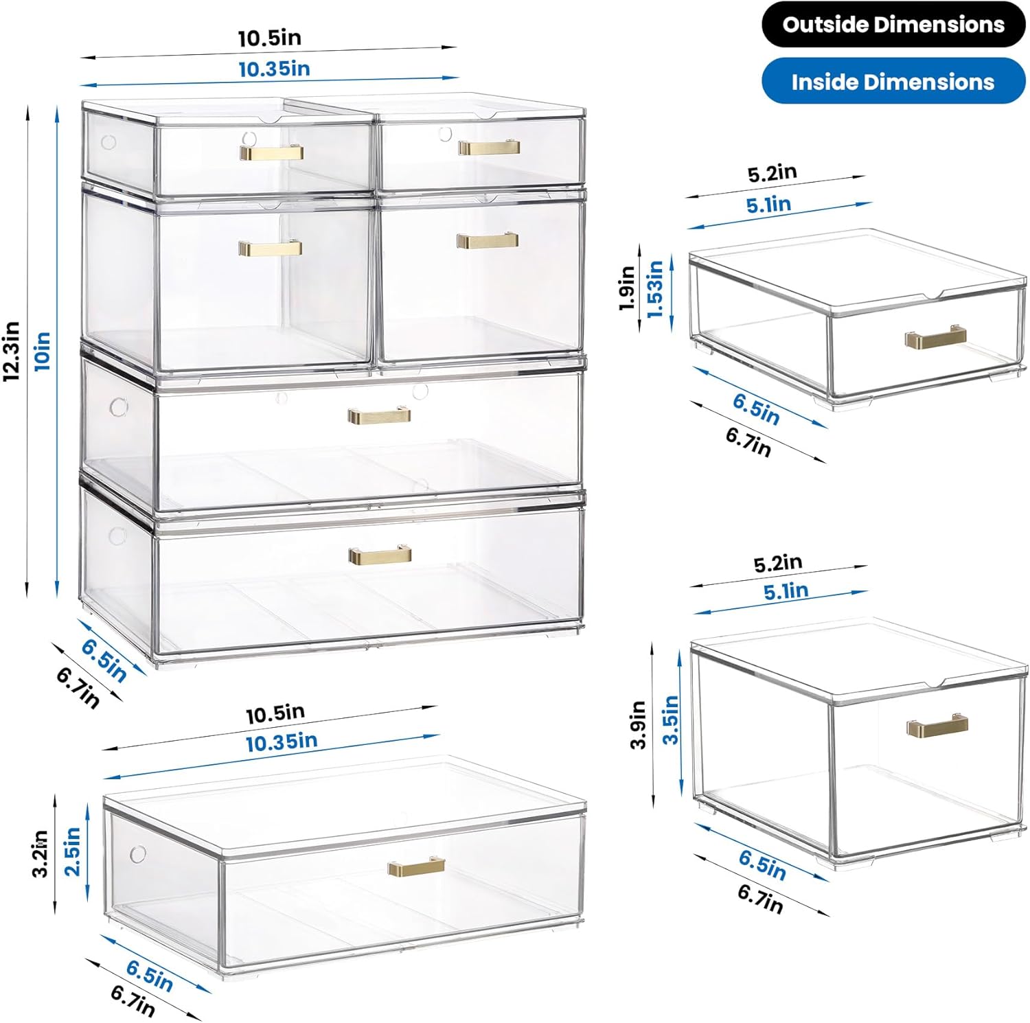 Stackable Storage Drawers, 6 Pack Clear Acrylic Organizer Bins with Golden Handles, Multi-Size Plastic Drawers for Makeup, Vanity, Kitchen, Bathroom, Office, Under Sink & Cabinet Organizatio