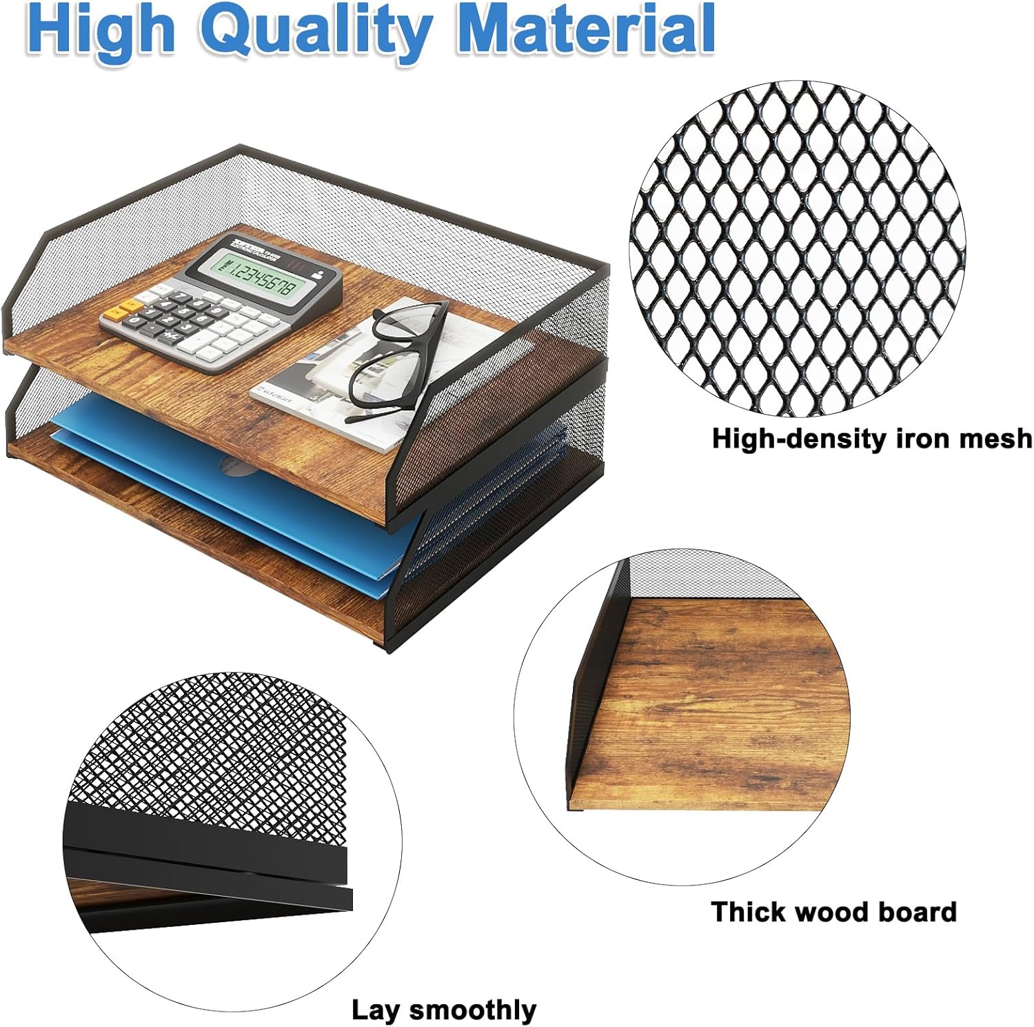 - 【Durable & Sturdy】The 2 tier desk organizer is made of high-density metal mesh and wood, and thick iron tray to avoid deformation. Reasonable structure, strong and durable paper tray.4 Anti scratch tray feet enhance the tray's usability, keeping your desk safe from unwanted scratches.
