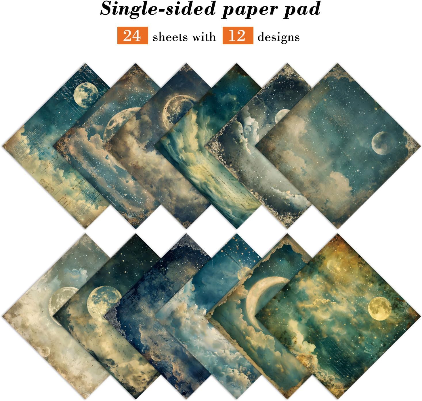 Moon Starry Sky Scrapbook Paper Pad - 24 Sheets 6x6 in Pattern Designed Decorative Decoupage Origami Folded Card Material for DIY Crafts Gift Wrapping Planners Junk Journal Supplies