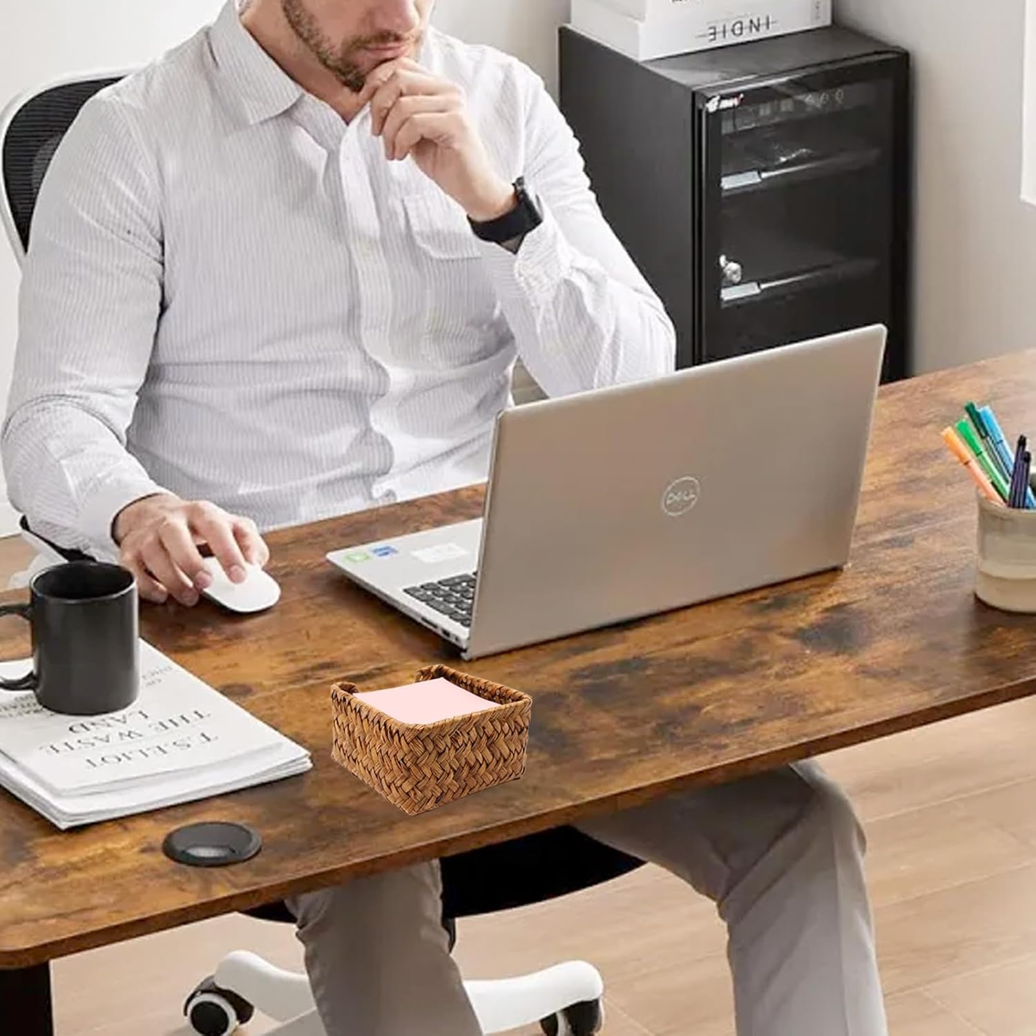 - No more digging through drawers looking for sticky notes! - If you feel messy and disorganized for your stationery, please try our wicker desk organizer to storage your desk supplies. It's also a great addition to home, office desk, the seagrass sticky note holder allows you to find paper fast when needing to capture ideas, exchange info, or write down deadlines. Perfect accessory for work desk.