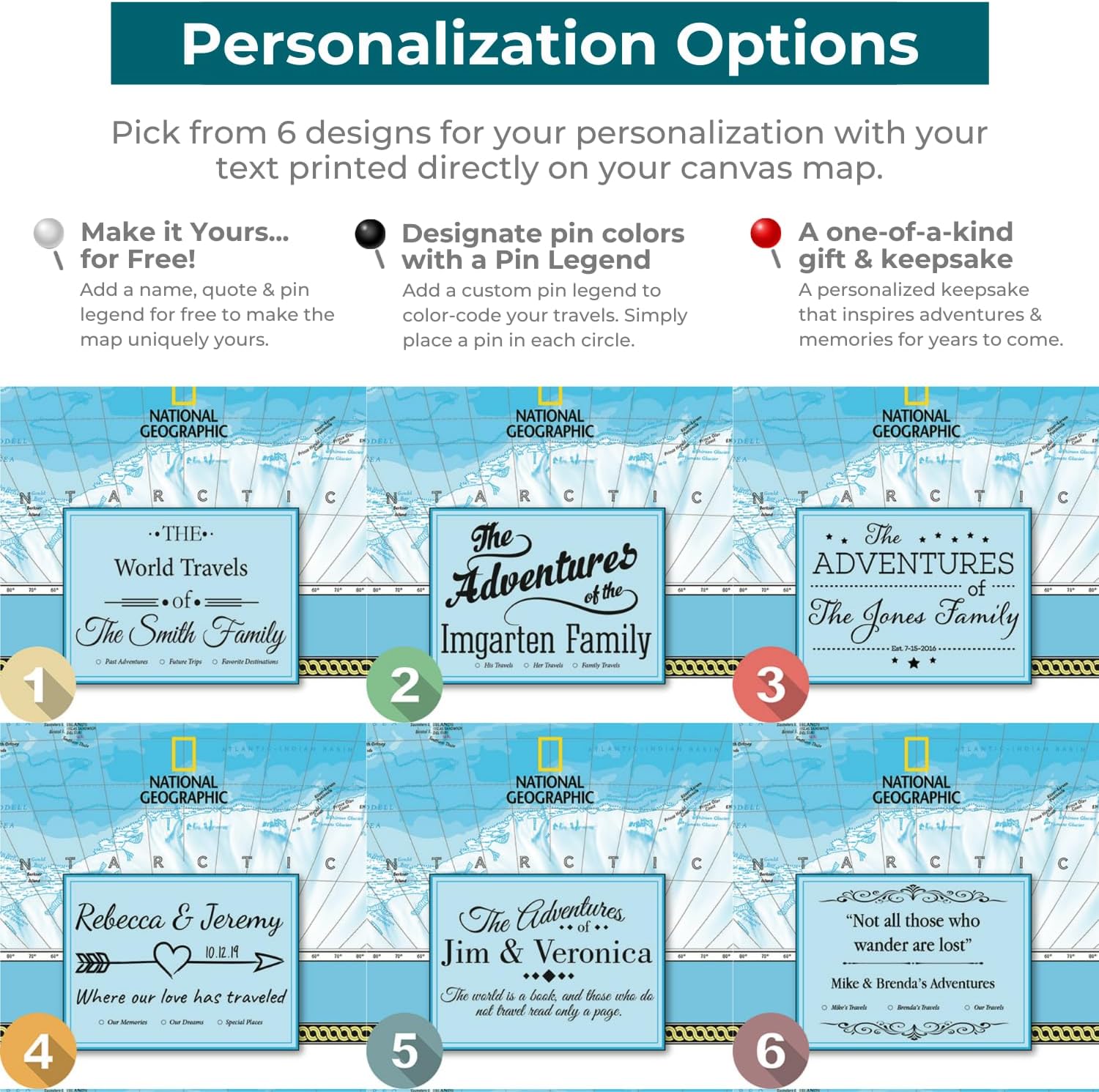 • Make It Your Own – Personalize your travel map with pins with your favorite travel quote or family names for a unique keepsake. A great conversation starter for your home or office, and a perfect custom gift for weddings, retirements, or graduations!