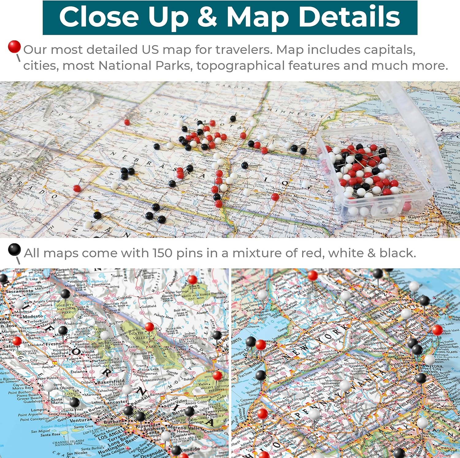 • Find the Perfect Fit – Choose from four sizes: 24"x36", 30"x45", 36"x54", or our extra-large 44"x66" to match your space. Each map includes 150 push pins in red, white, and black to mark your travels!