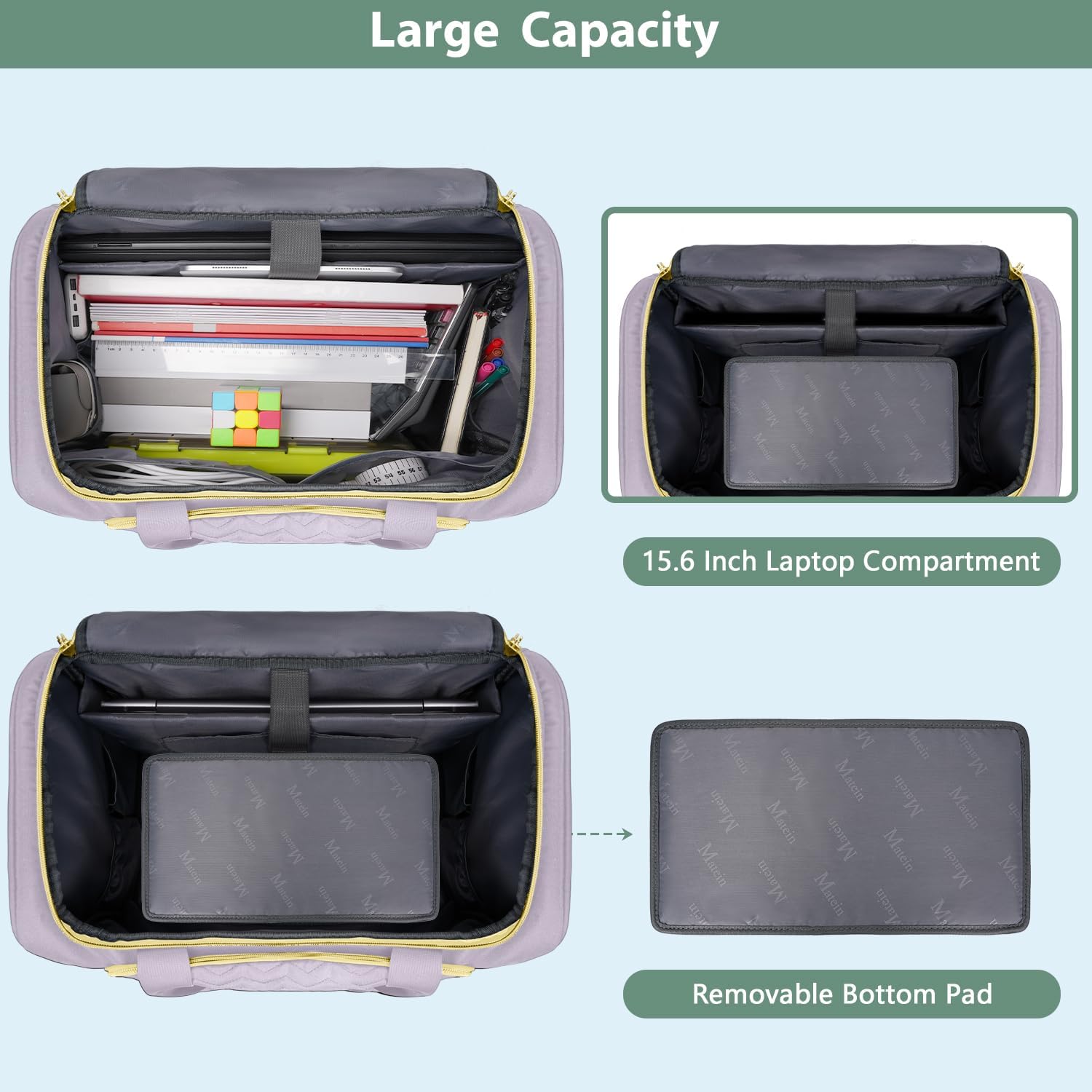- Large Capacity & Organized: Size :15.5 x 9.8 x 14.5 inches. Capacity: 35 L. The rolling office bag features large main compartment to support the mass of files, aim to ease the heavy loaded commuter like from home to office. Rolling case with wheels for women can accommodate folders and 15.6 inch laptop in the padded sleeves. And rolling laptop bag has equipped a thick removable padded, which can be laid flat on the bottom of the women's rolling laptop bag to keep the items stable