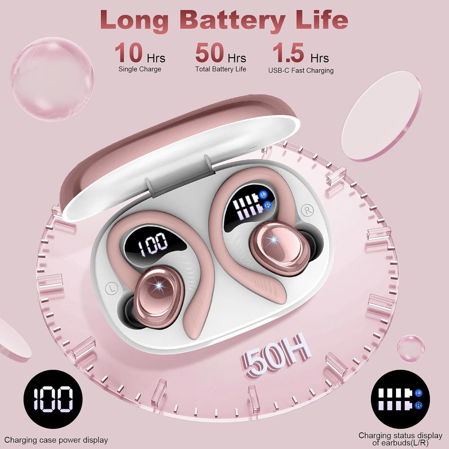 - 50 Hours of Ultra-long Battery Life, Music Never Stops: The high-performance battery supports 10 hours of single playback of the noise cancelling earbuds, and a total battery life of 50 hours can be achieved with the charging box, without frequent charging. USB-C fast charging technology allows you to fully charge in just 1.5 hours, ready to accompany your music journey at any time.