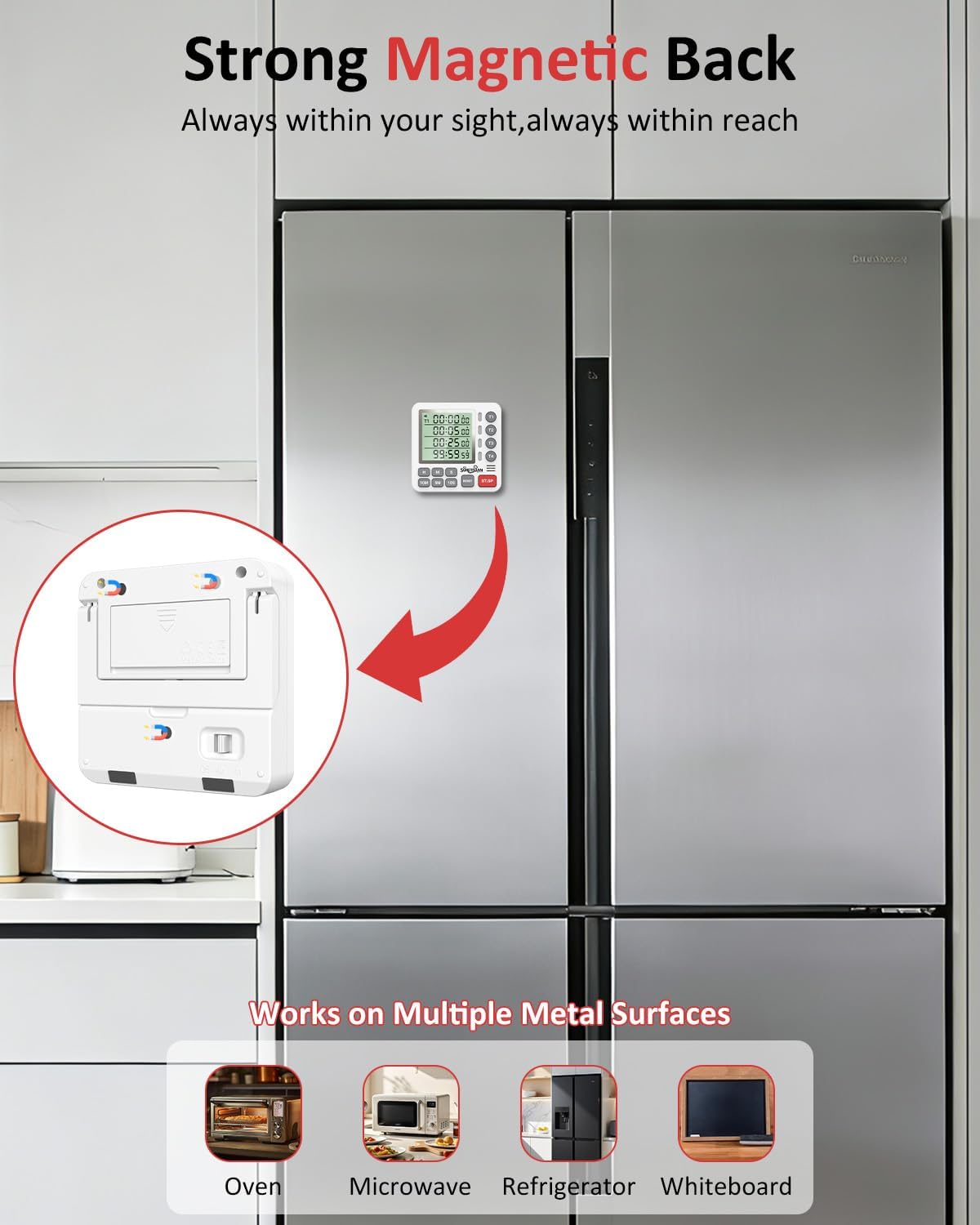 - Magnetic Back for Easy Placement Anywhere: The built-in strong magnetic back securely attaches the timer to your fridge, oven, microwave, or any metal surface, keeping it firmly in place without slipping or falling.Prefer countertop use? Simply flip out the sturdy adjustable stand for stable upright viewing. Keep the timer at eye level for quick checks, grab it easily when needed, and enjoy hands-free convenience while cooking. Perfect for kitchen cooking, workouts, classrooms, homework, meetings, and more