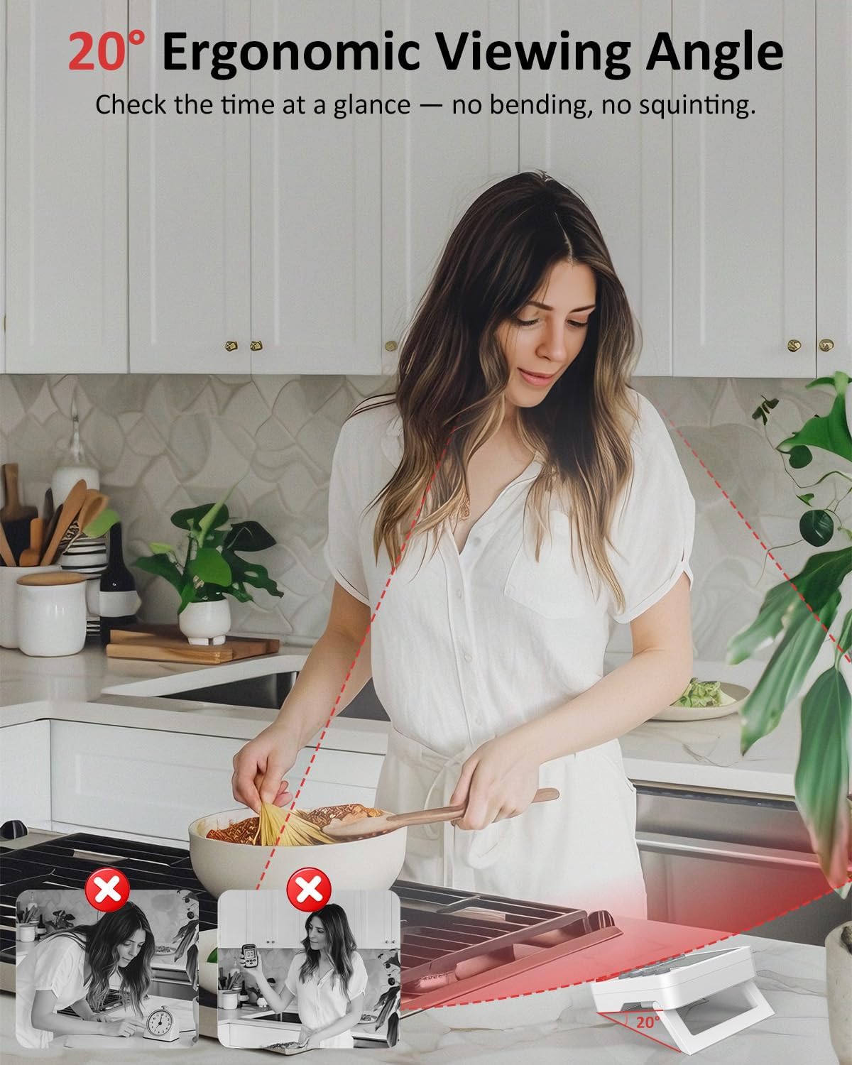 - Designed for Better Visibility While You Cook: The upgraded stand lets you adjust the cooking timer to a comfortable 20° countertop viewing angle, making the screen easier to read while chopping, stirring, or moving around the kitchen. This angle reduces glare and aligns better with natural eye movement, giving you a clear view of your countdown from almost any position. No need to bend down or squint