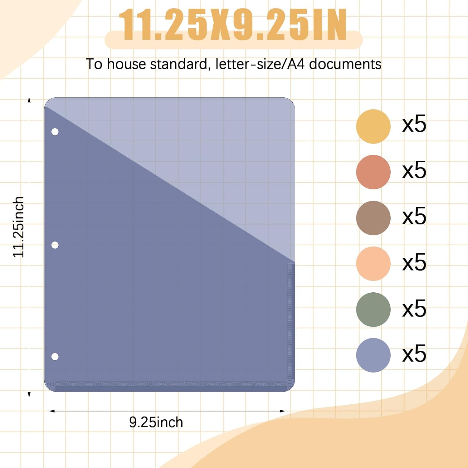 Maitys 30 Pack Binder Pockets 3 Hole Punch Clear Plastic Document Folders Binder Organizer Store Letter Size 8.5x11 Inch Paper Folders with Pockets Slash File Jacket for Office (Simple Color)