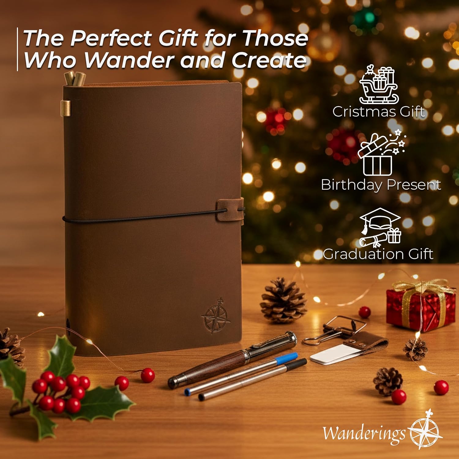 • [Complete Accessories Set]: This bundle adds the Wanderings refillable A5 travel notebook with a convenient leather pen holder, a pen with 2 extra ink refills (3 ink refills in total), a clear PVC zipper folder for storing essentials, and a binder clip to secure your pages— designed for a fully equipped journaling experience