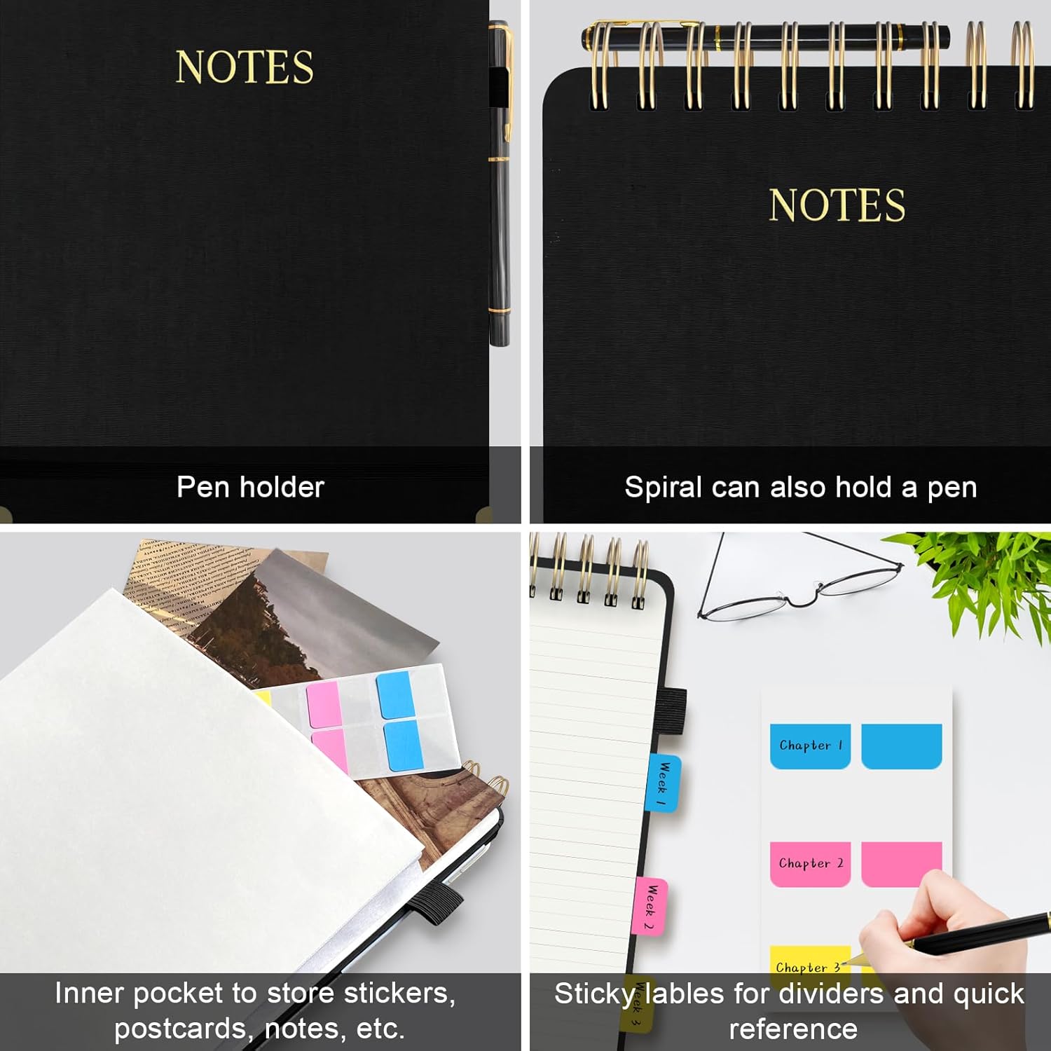 - 【WITH PEN & PEN HOLDER】This top spiral notepad comes with a sleek metal pen, a pen loop, and a built-in back pocket for storing postcards, notes, etc. The double-wire binding also securely holds additional pens, offering convenience for on-the-go use. The included sticky divider tabs help you organize and categorize your notes effortlessly, ensuring easy access and organization of your notes by topic, project, or date.