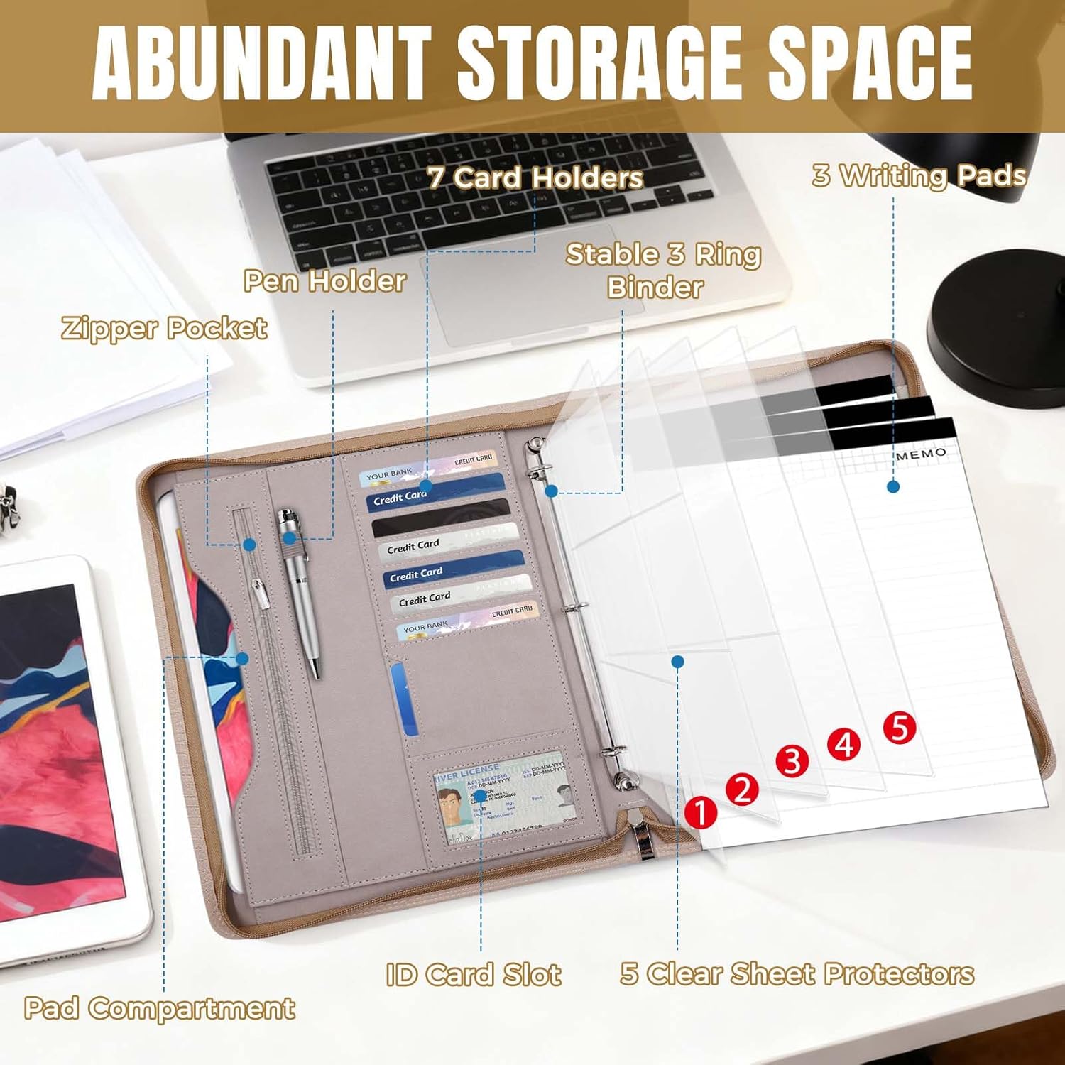 - LARGE CAPACITY:Multiple Functions Portfolio include with a Clipboard, a Tablet Sleeve,5 pages transparent binder pockets,several Document Pockets, a zippered pocket,7 Card Slots, and a Pencil Holder. Neat and Practical Organized All Your Stuff. This super business binder padfolio is big enough to safely store what you need yet is compact, stylish & travel-friendly.