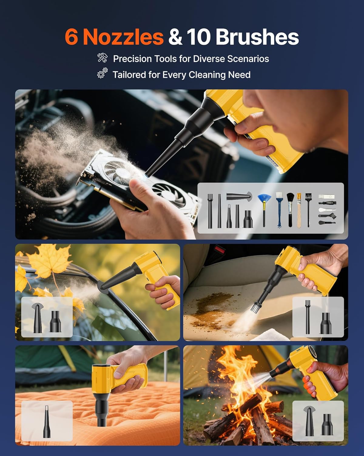 - [6 Versatile Nozzles & 10 Detail Brushes] Offer tailored solutions for every cleaning task, from delicate computer keyboards and sensitive electronics to car detailing, home deep cleans, and even outdoor inflation tasks. One tool, infinite mastery.