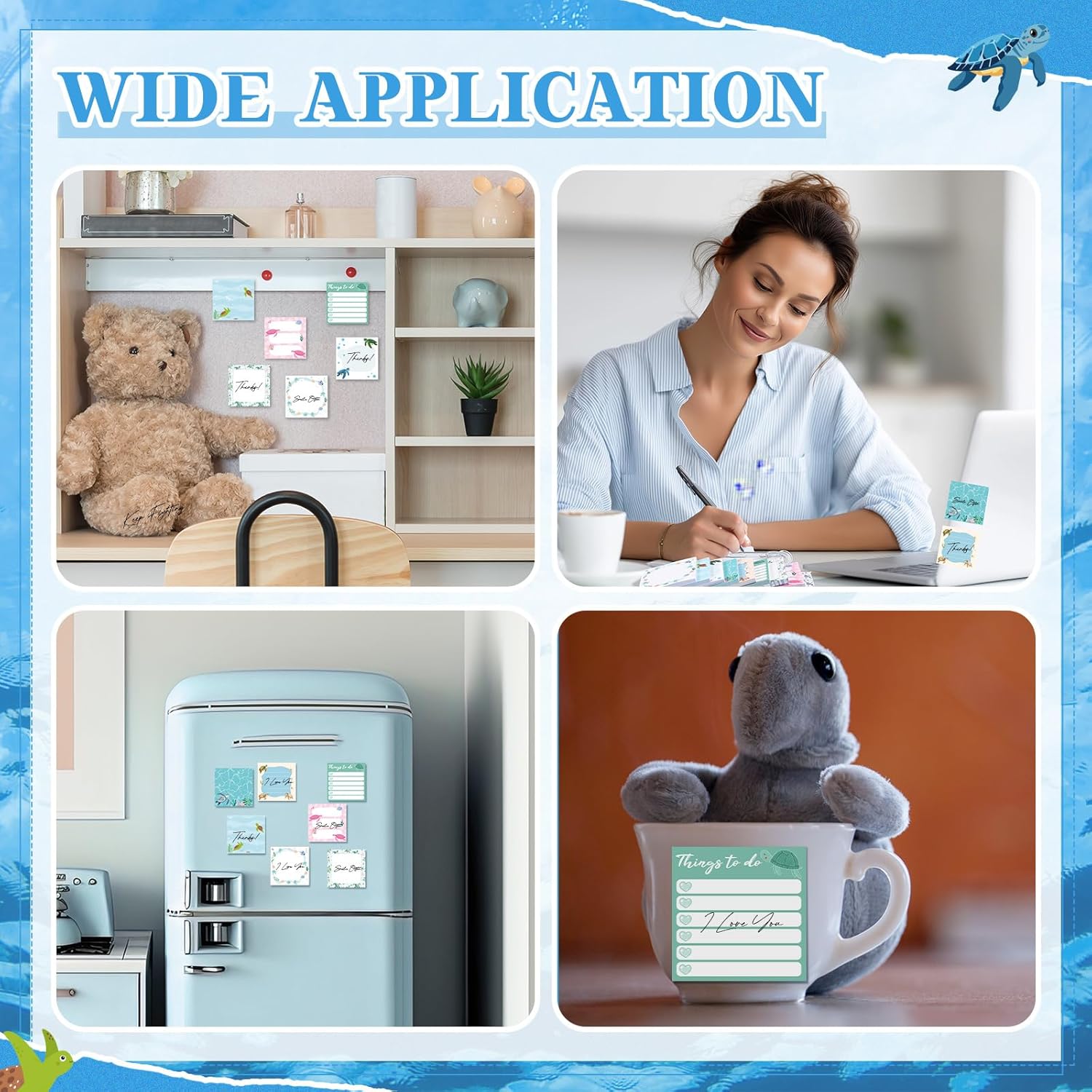 - Extensive Usages: the turtle print sticky notes are suitable for writing memos, messages, notes, information, footnotes, to-do lists, study plans, etc., to paste on even surfaces, such as walls, computers, whiteboards and more, which can keep the notes sticky firmly, they can also be applied as bookmarks or reminders to use