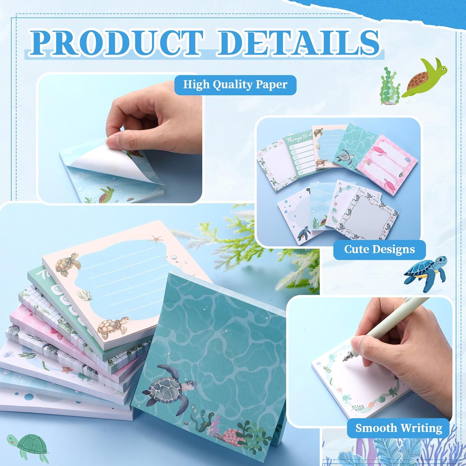 - Delightful Turtle Design: the turtle sticky notes sport a vivid design of these lovely creatures; Each sticky note features an intricate pattern that captures the distinctive characteristics of the turtles, from their unique shells to their gentle swimming posture; This makes a pleasurable inclusion to the sticky note array of any turtle or ocean enthusiast