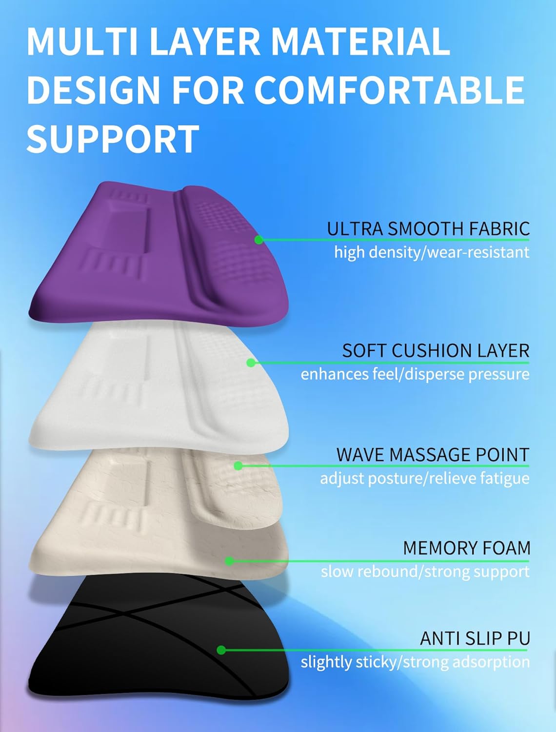 • 【 Feel Wave Wrist Rest 】 The horizontal wave design puts your hands, wrists, and forearms in a natural typing position, with a vertical tilt transition for more palm support and less pressure, providing all day protection for your wrists