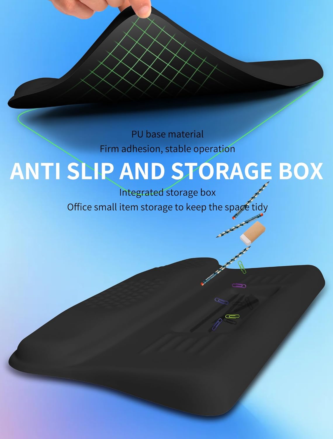 - 【Compact Design with Storage Box 】17.3x9.8x1.2inch (440x250x30mm), compact curved appearance, equipped with a storage box for commonly used office small items (pens/paper clips/staples, etc.), keeping your desktop tidy at all times
