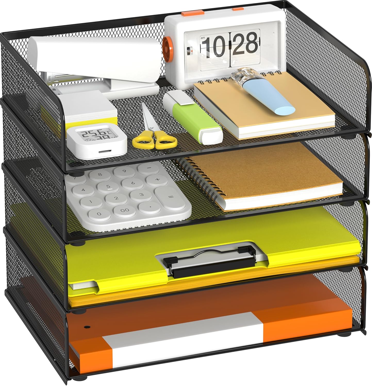 YINGHUA 4-Pack Metal Mesh Stackable Paper Letter Trays Organizer for Classroom,Office Desk File Sorter Holder Organizer Storage Box for Letter/A4 Size Folder Documents-Black