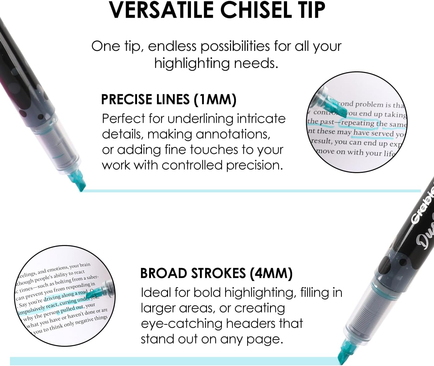 - VERSATILE CHISEL TIP - Each pen is equipped with a narrow chisel tip that offers dynamic control. Effortlessly switch between creating precise, fine lines for underlining and detailed annotations or bold, broad strokes for highlighting and filling in larger areas.
