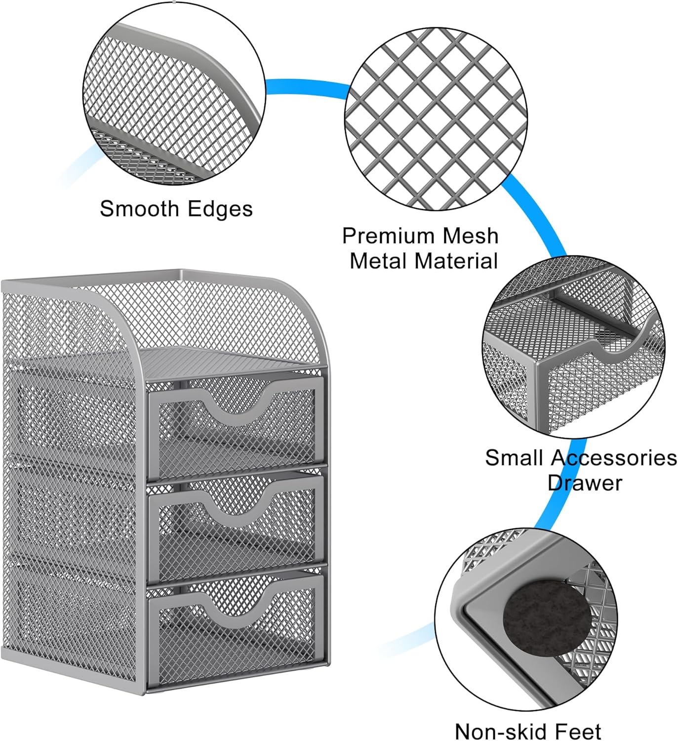 EasyPAG Mesh Desk Organizer with 3 Drawer Office Desktop Organizers and Accessories Stationery Caddy for Office, Home, Students, Silver