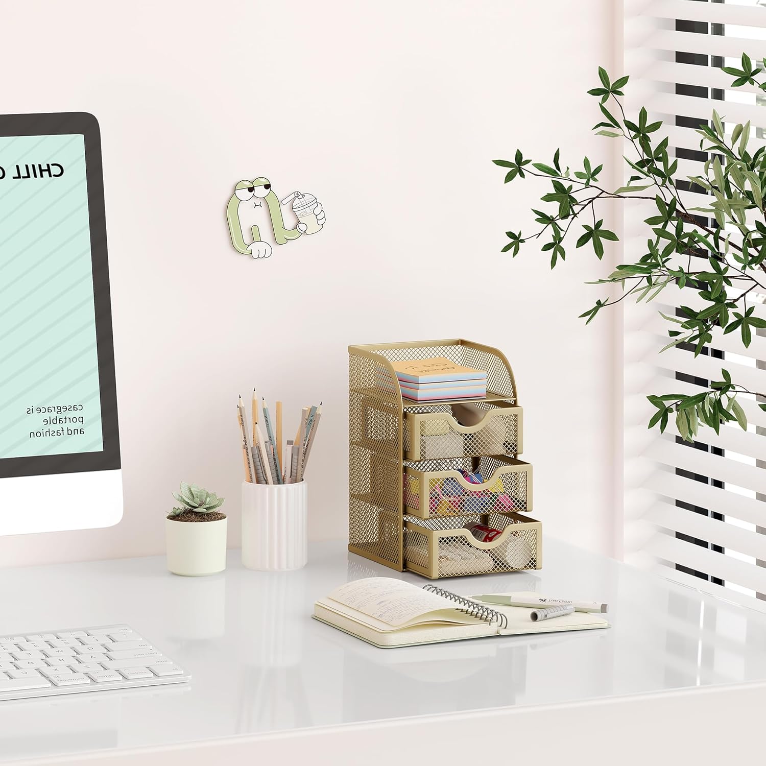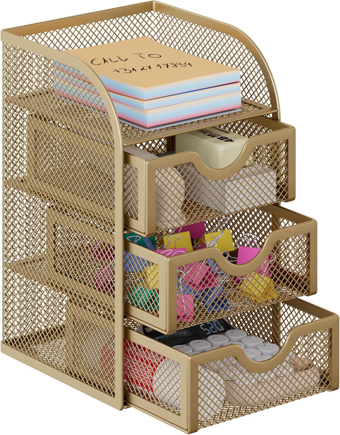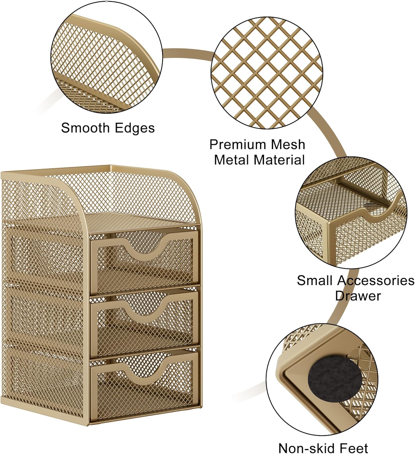 EasyPAG Mesh Desk Organizer with 3 Drawer Office Desktop Organizers and Accessories Stationery Caddy for Office, Home, Students, Gold