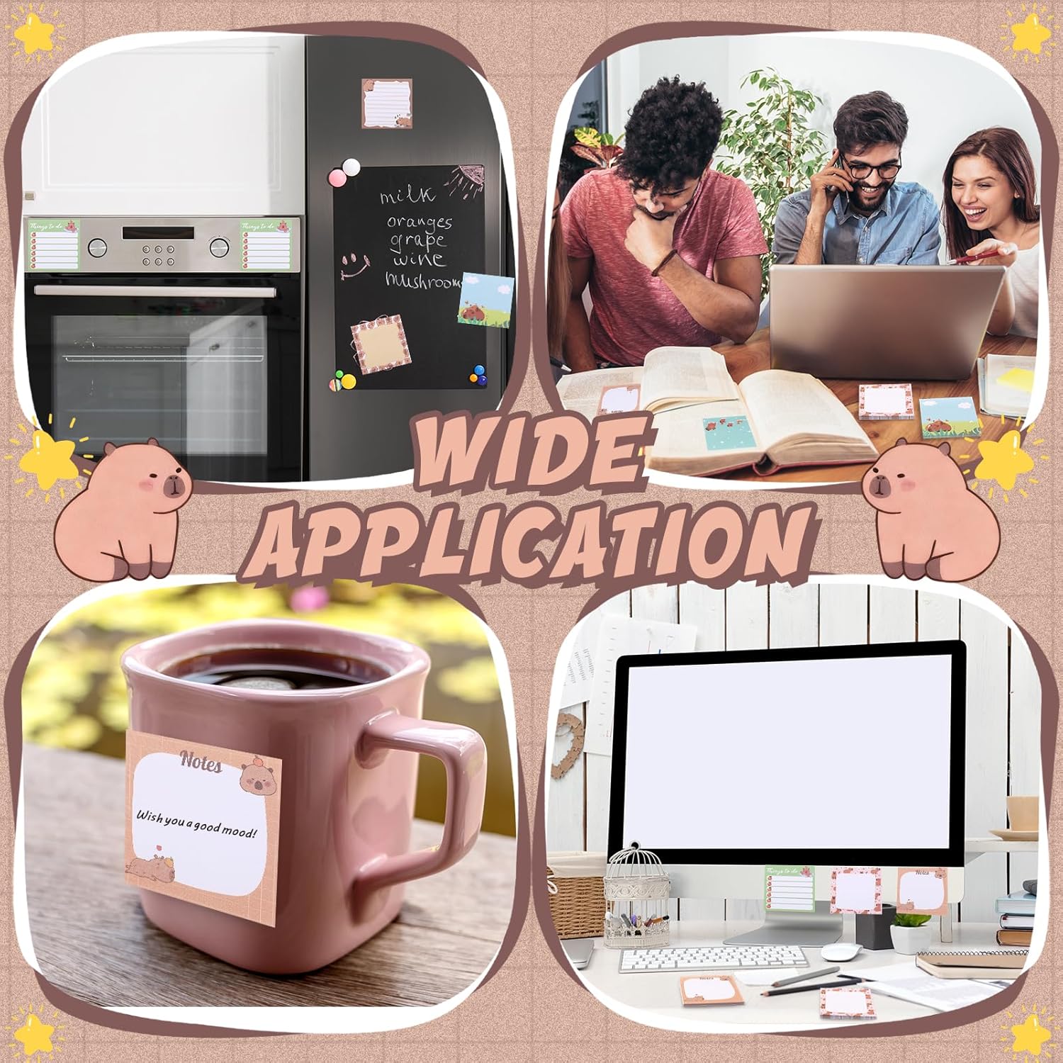- Extensive Usages: the Capybara print sticky notes are suitable for writing memos, messages, notes, information, footnotes, to-do lists, study plans, etc., to paste on even surfaces, such as walls, computers, whiteboards and more, which can keep the notes sticky firmly, they can also be applied as bookmarks or reminders to use