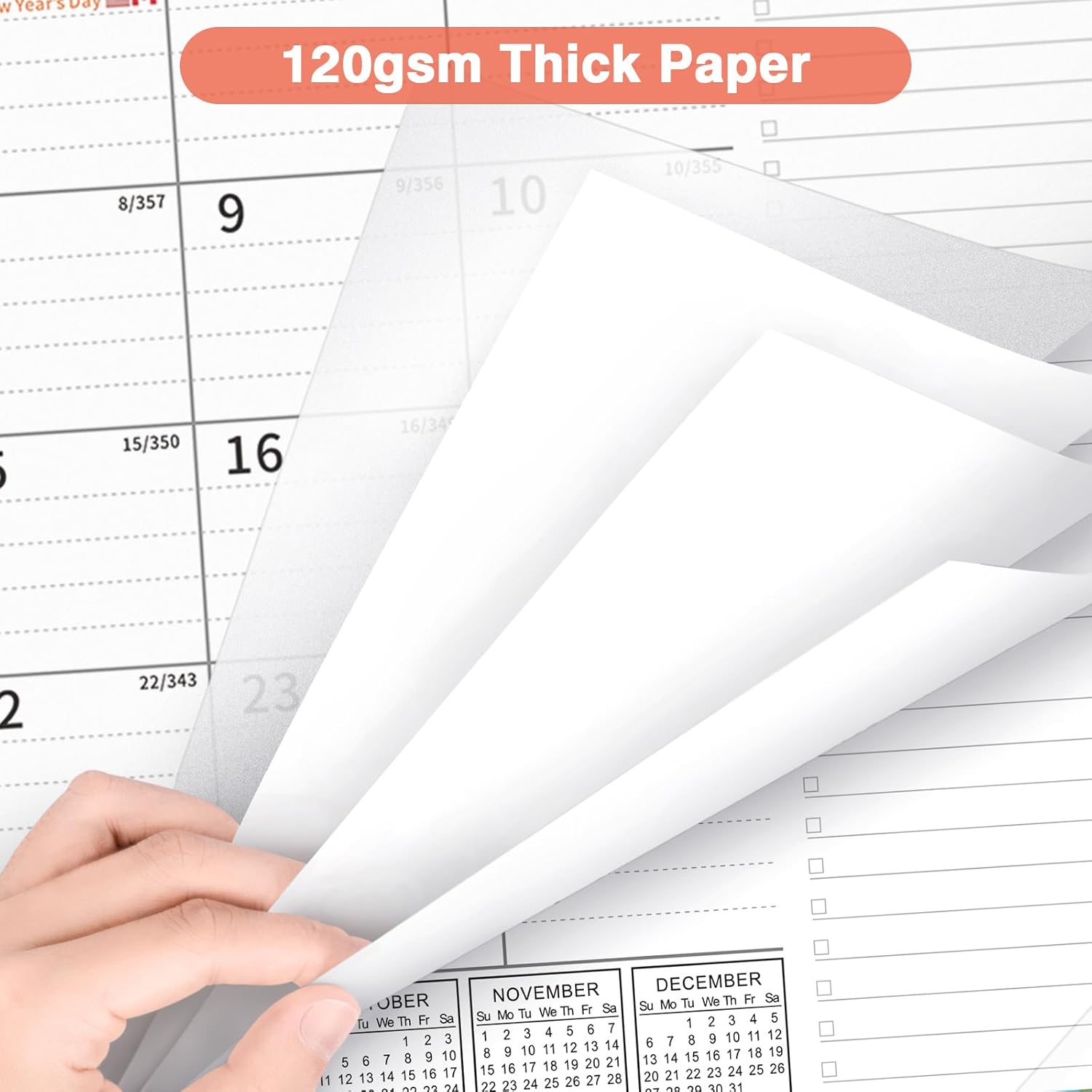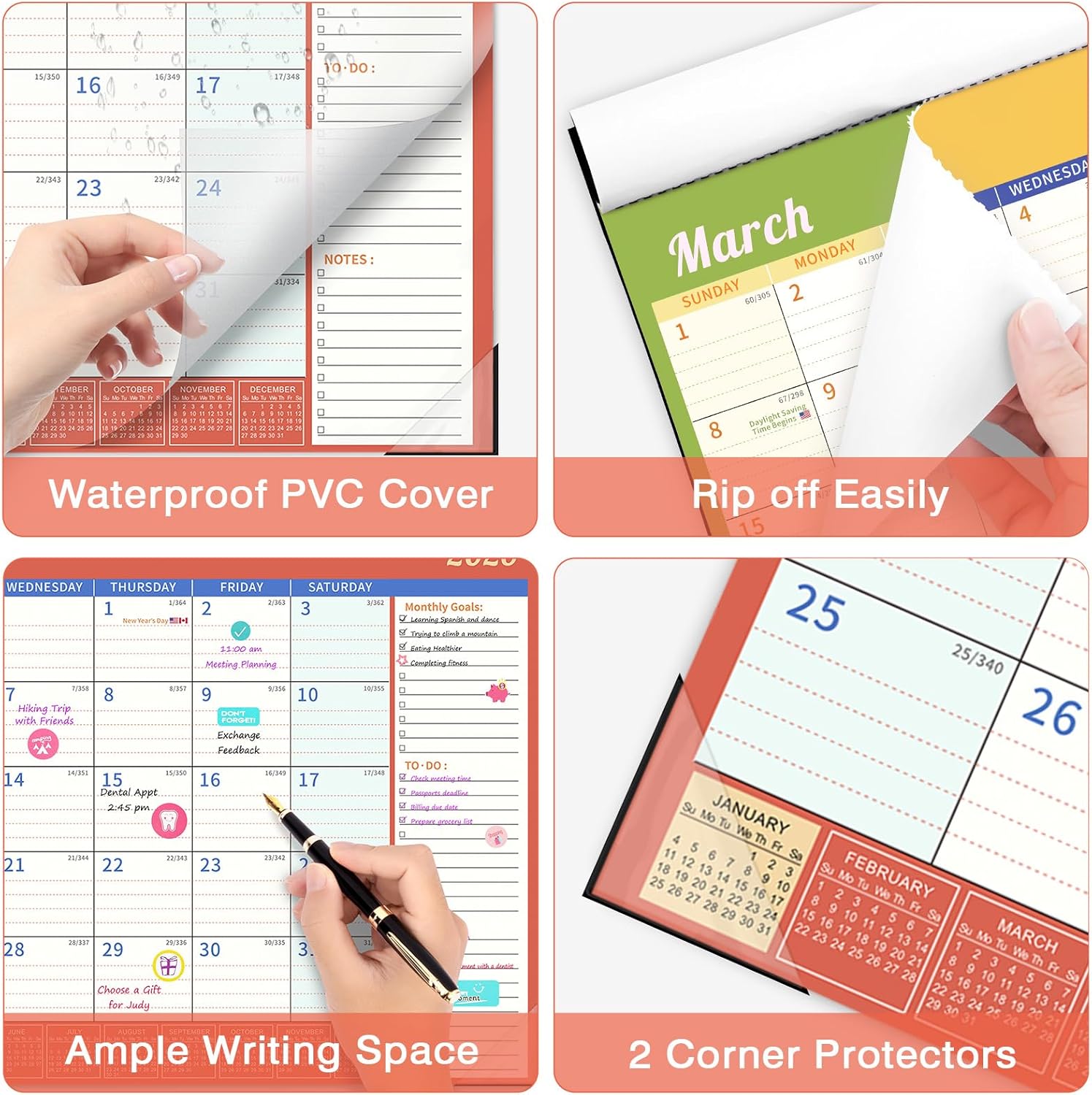 - Calendar Features: Thick paper resists ink seepage, ensuring clean and crisp writing. It comes with a transparent PVC cover to protect against dust and liquids, along with two corner protectors to keep the pages flat. The cutting line allows for effortless tearing of each month's page, making it perfect for long-term use as a wall calendar.