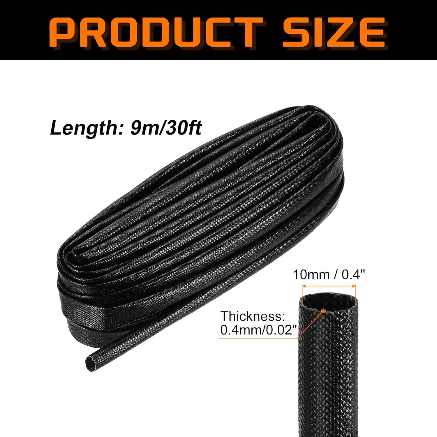 - The wire organizer we provide here is in dimensions of: Length: 9m/30ft; Inner Diameter: 10mm/ 0.4 inch; Thickness: 0.4mm/0.02inch; Material: Silicone Fiberglass; Working Temp Range: 200℃; Working Voltage: 1500V; Packing List: 1 Pcs x Braided Cable Sleeve.