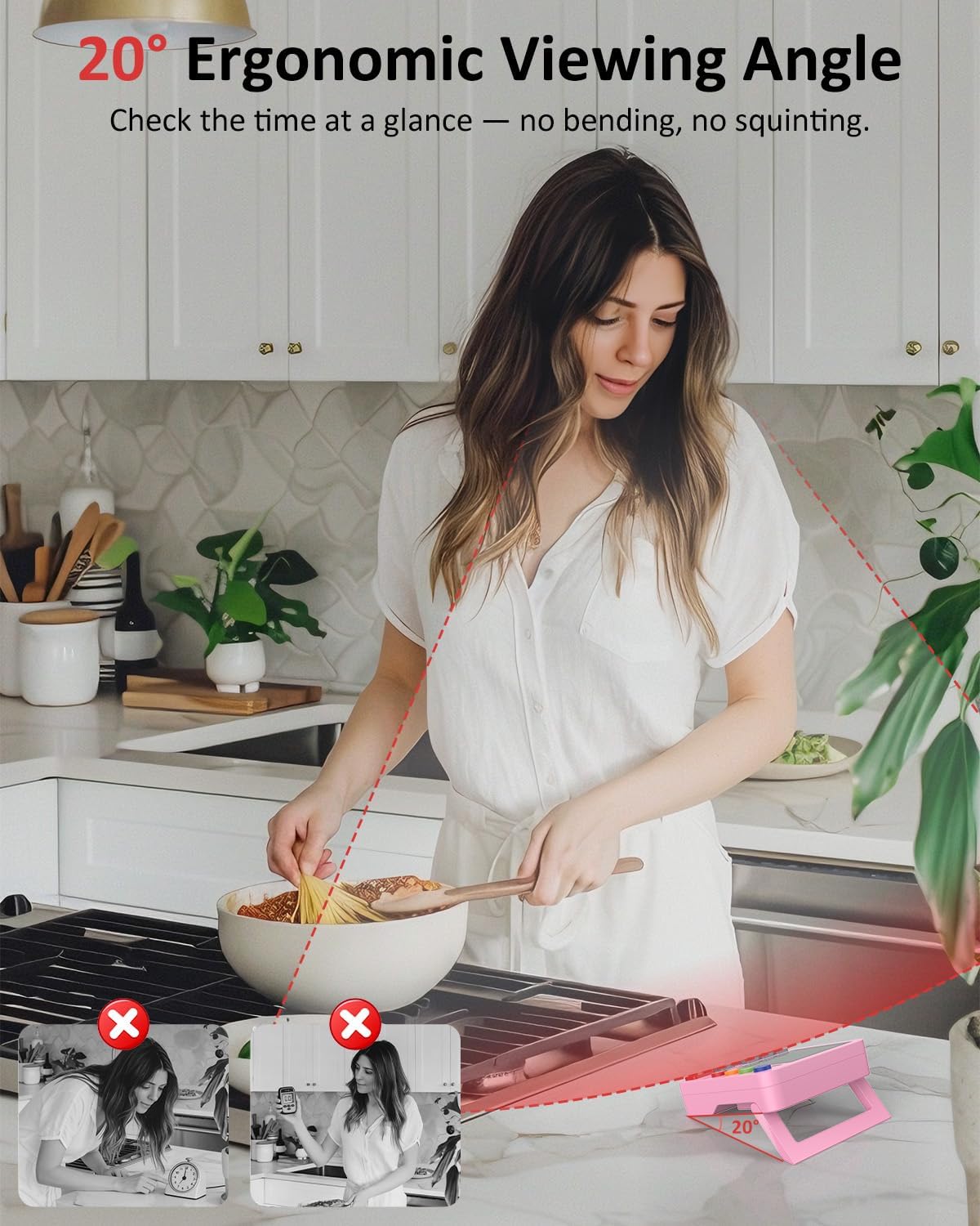 • Designed for Better Visibility While You Cook: The upgraded stand lets you adjust the cooking timer to a comfortable 20° countertop viewing angle, making the screen easier to read while chopping, stirring, or moving around the kitchen. This angle reduces glare and aligns better with natural eye movement, giving you a clear view of your countdown from almost any position. No need to bend down or squint