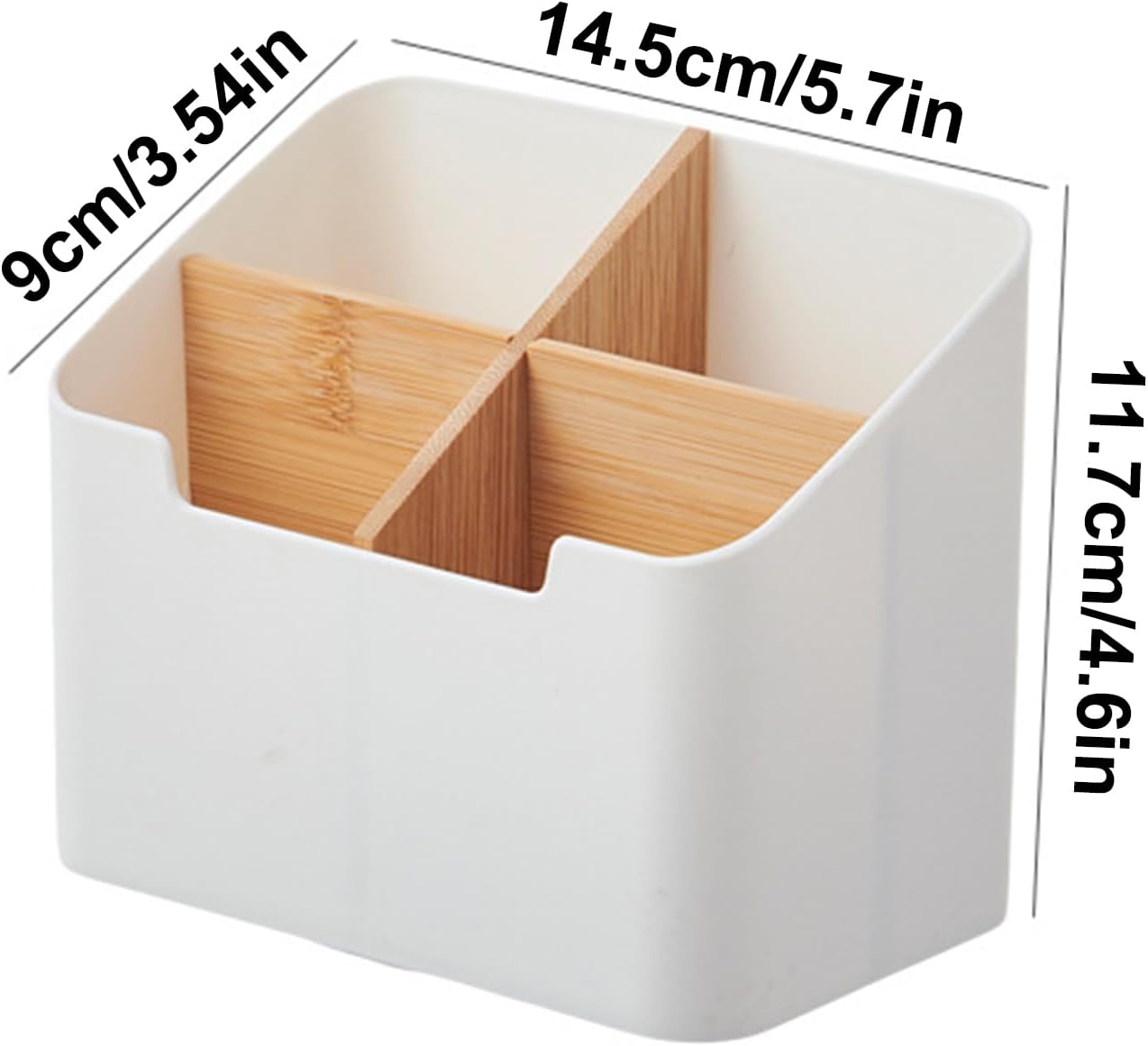 - Versatile Design: With four different compartments made of ABS wood, this and multifunctional remote control holder adds a touch of style to your desk while organizing your small items. Keep your TV remotes, pens, stapler, scissors neatly in place.