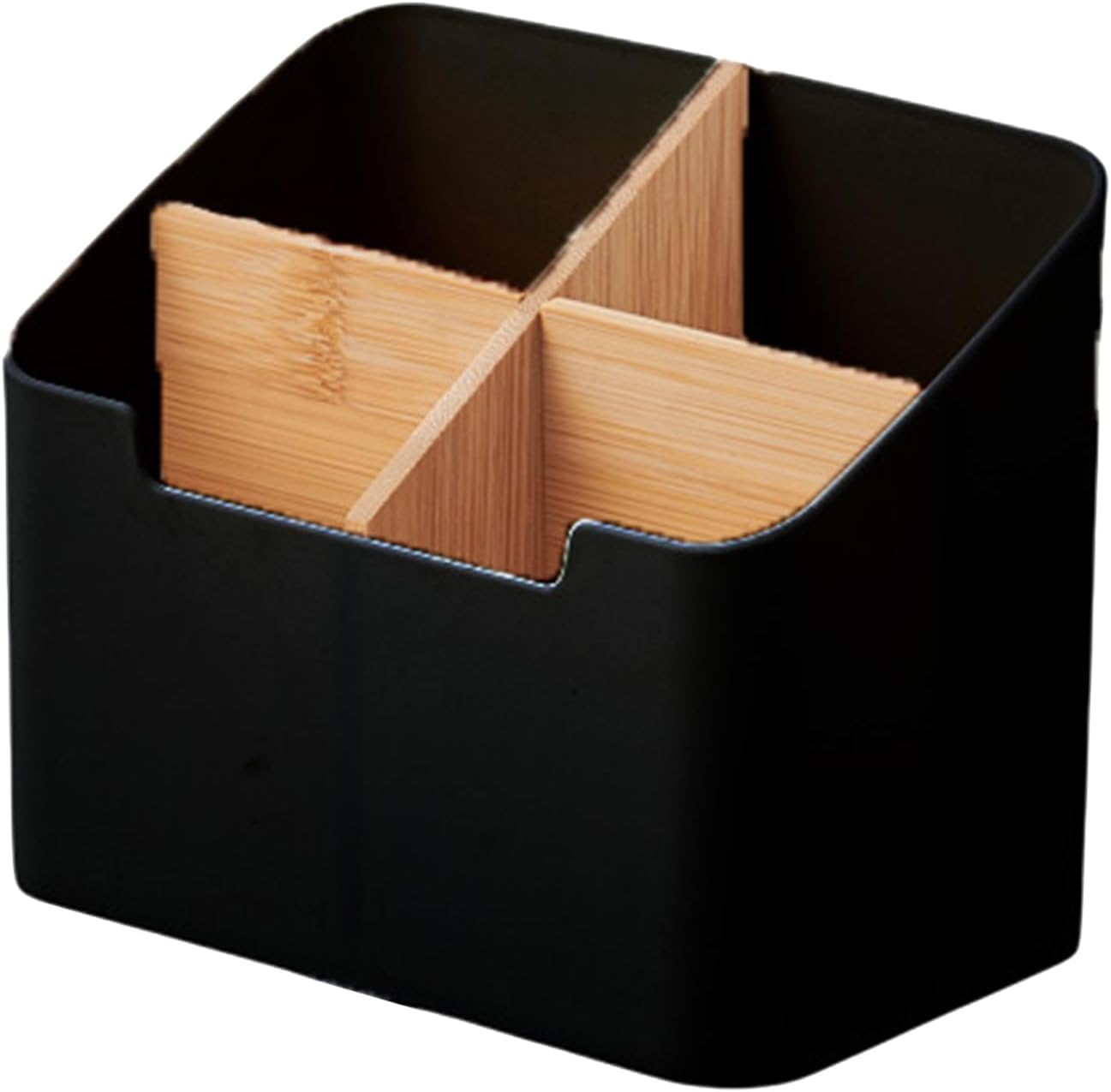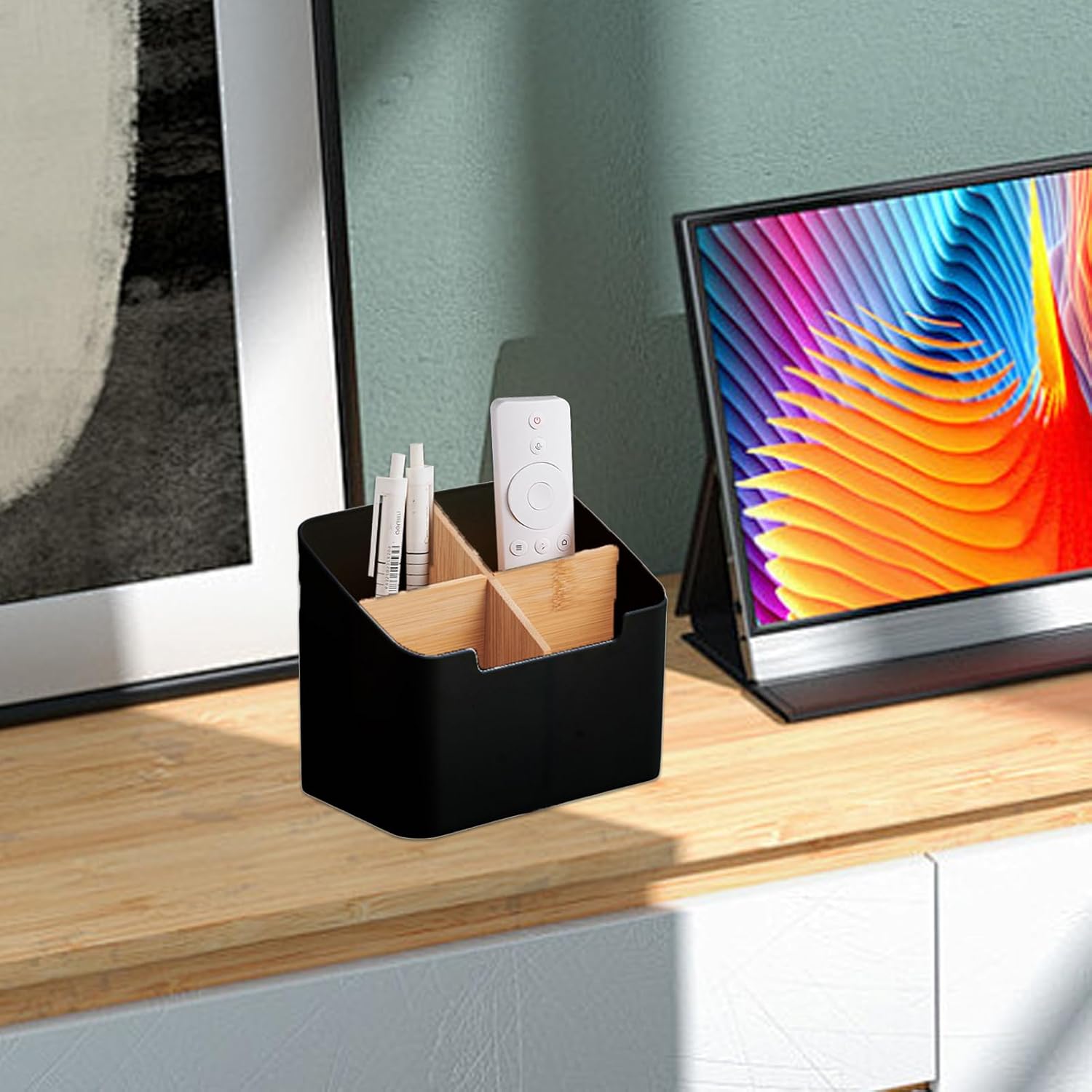 - Versatile Design: With four different compartments made of ABS wood, this and multifunctional remote control holder adds a touch of style to your desk while organizing your small items. Keep your TV remotes, pens, stapler, scissors neatly in place.